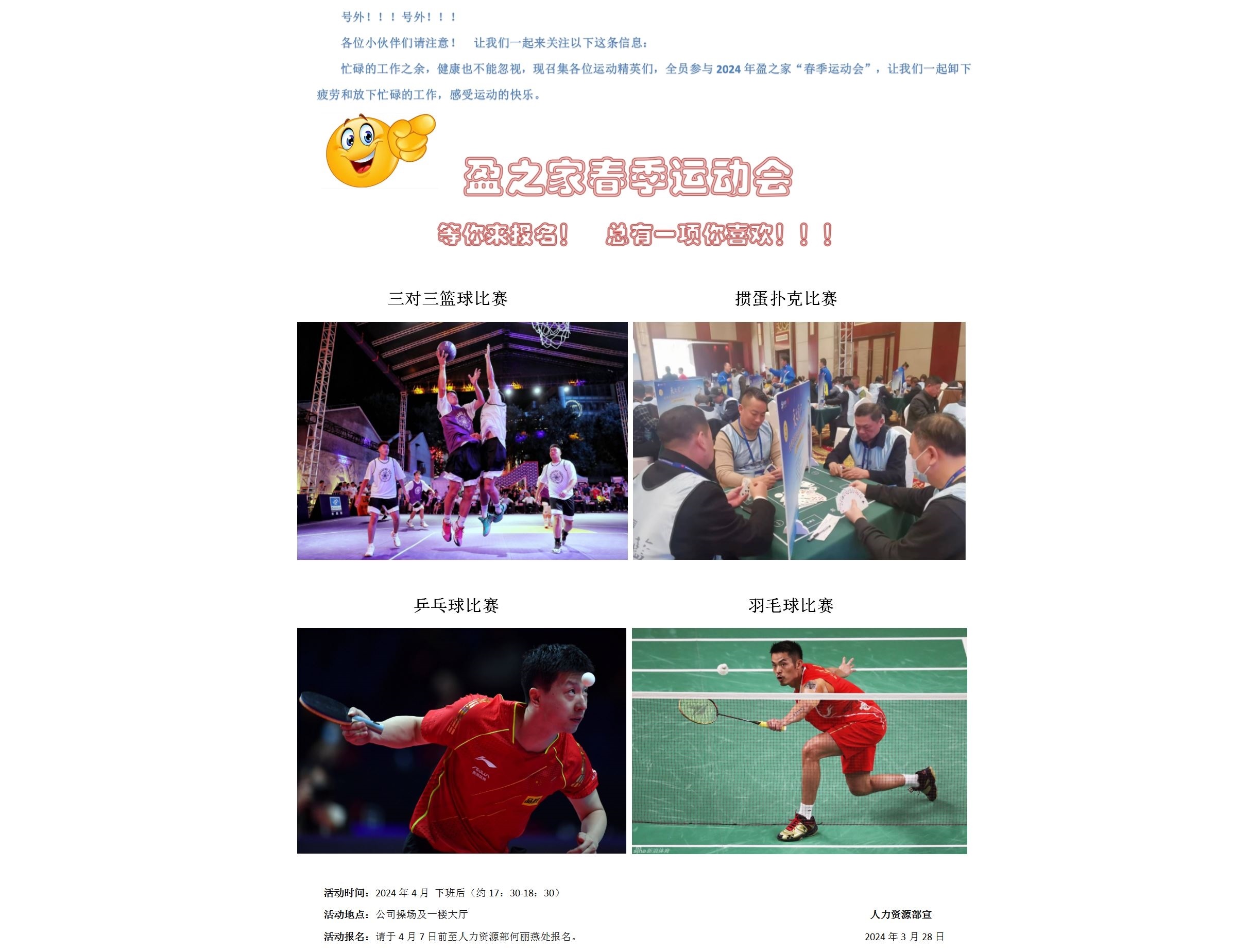 忙碌的工作之余,健康也不能忽視,現(xiàn)召集各位運(yùn)動(dòng)精英們,全員參與 2024 年盈之家“春季運(yùn)動(dòng)會(huì)”,讓我們一起卸下疲勞和放下忙碌的工作,感受運(yùn)動(dòng)的快樂(lè)。